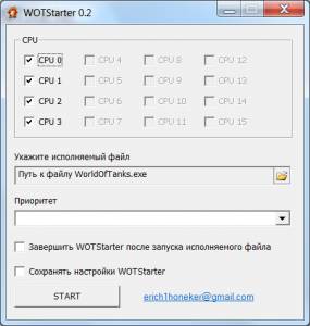 Производительность игры увеличевается, если на многоядерных процессорах запретить использовать игре первое ядро. Программа позволяет запускать WOT на определенных ядрах CPU и выставлять нужный приоритет для процесса игры. Инструкция: запускаете WOTStarter, отключаете первое ядро CPU (CPU 0); указываете путь в WorldOfTanks.exe (не к лаунчеру, а именно к клиенту игры); выбираете приоритет (лучше всего "Выше среднего") и жмете "Старт". Автор: h13